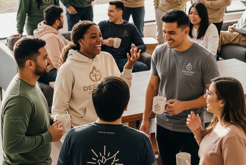 A man and woman smile while exchanging a card at a merchandise table displaying Destiny Church hoodies, shirts, and mugs—perfect for church fundraising. Others in branded clothing chat nearby, with signs and a digital tablet on the table.One of the most significant benefits of church merchandise is its ability to foster community and identity among congregants. When you wear items that represent your church, it creates an immediate connection with others who share your beliefs. This sense of belonging can be particularly important in today’s fast-paced world, where individuals often seek meaningful relationships and support systems.
