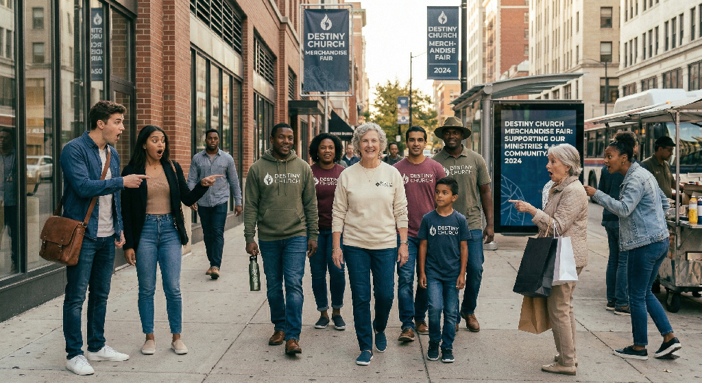 People gather outside near tables displaying church merch like shirts, hats, and mugs at a Destiny Church fundraiser. Signs read “Shop to Support.” Attendees converse and browse merchandise in a friendly atmosphere promoting church branding.When you purchase church merchandise, you are often contributing directly to the support of various ministries within your church. Many congregations use the proceeds from merchandise sales to fund outreach programs, community service initiatives, and other vital activities that align with their mission. By choosing to buy a T-shirt or other items, you are not only expressing your faith but also actively participating in the growth and sustainability of your church’s ministries.